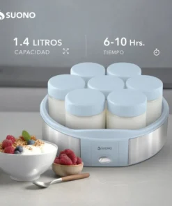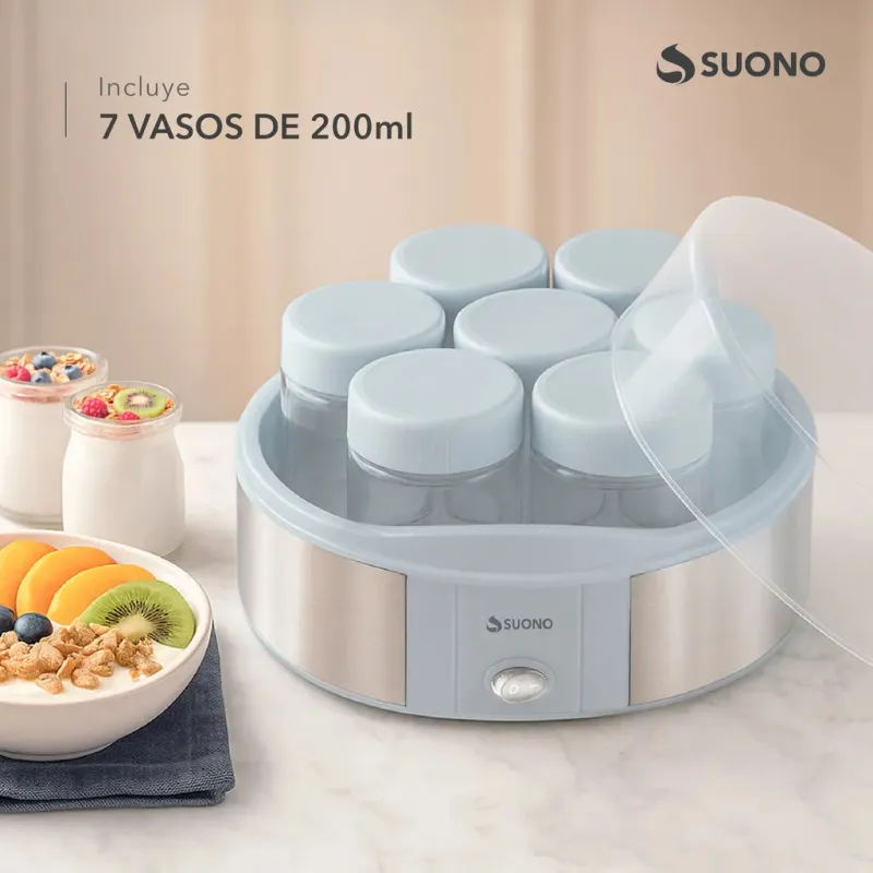 La Yogurtera Suono 7 Vasos es la opción ideal para quienes buscan preparar yogur casero de manera práctica, económica y saludable. Con capacidad total de 1.4 litros distribuida en 7 frascos de vidrio reutilizables de 200 ml cada uno, te permite elaborar distintas variedades y sabores en un mismo ciclo, adaptándose a los gustos de toda la familia.